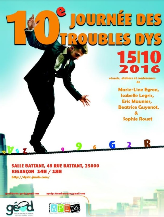 – Marie-Line EGRON, consultante en recrutement et fondatrice de l’APEDYS Franche-Comté interviendra sur les ressources que chacun peut mobiliser en soi, principalement les Dys ; Enfin, une présentation des ordinateurs Ector, adaptés aux Dys, sera réalisée pour que chacun puisse en mesurer l’intérêt. La journée se déroule à la salle Battant, rue Battant à Besançon.