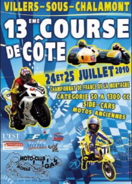 Sur la piste 8 catégories seront représentés des 50 aux 1300 centimètres cube en passant par les motos anciennes et sides-car. C’est sur la Route des sapins entre Villers-sous-Chalamont et Boujailles par le col de Chalamont à 8km de Levier que vont s’affronter les pilotes. 3km de course rapide coupés par 2 chicanes, des protections réalisées avec 60 tonnes de paille. Des virages spectaculaires notamment la 2e chicane et le fameux FFI (monument mémoire des fusillés de la guerre). Cette année, le moto Club a dans ses rangs les champions de France de la montagne 2009 catégorie Side-car, Olivier Dichamp pilote et son coéquipier Aurélien Pourcelot. Ils sont en tête cette année du championnat 2010. En 600 cc Anthony Oren fini 5e à March aux la course précédente et François-Alexandre 6e en 1300 cc. La nouvelle recrue du club, Christian Petitjean fini 4e à Marchaux.