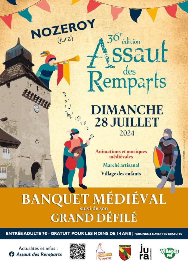 En l’an de grâce 2024, Nozeroy vous convie une fois de plus à son Assaut des Remparts pour une 36e édition placée sous le signe de la ripaille et de la bonne humeur. Le dimanche 28 juillet, la cité fortifiée de Nozeroy ouvrira ses portes pour vous faire vivre une journée médiévale inoubliable, pleine de spectacles, de découvertes et de réjouissances.