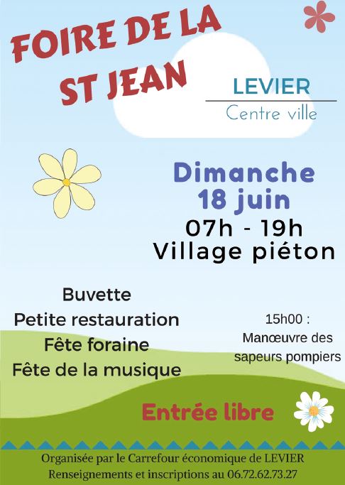 Pour la troisième année consécutive, une grande foire aura lieu à Levier dimanche 18 juin. Grande nouveauté pour cette année : la fête de la musique s’invite à la foire, avec la collaboration de la communauté de communes et de l’école de musique Musicart’s. Levier sera en fête dès le samedi 17 juin où trois groupes de musique se produiront place de la Mairie : Korrigan’s Celtic Rock, Après la ville et Princesse(s).