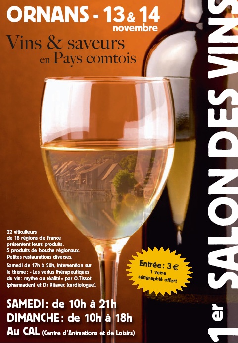 Pour la troisième année consécutive, l’association Vins et Saveurs en Pays Comtois organise son salon des vins. Fort du succès des années précédentes, tous les amateurs de bons vins pourront se rendre durant deux jours au CAL (Centre d’Animations et de Loisirs) à Ornans. L’occasion de déguster les différents vins représentés, à savoir 26 viticulteurs de toutes les régions de France. Le dimanche à 16h, vous pourrez également participer à la conférence donnée par Xavier Guillaume, viticulteur, sur la culture des cépages. Comme les années précédentes, le prix d’entrée du salon est de 3 euros et un verre sérigraphié vous sera offert. Vous aurez également la possibilité de vous restaurer sur place.
