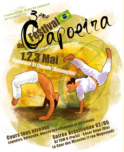 Avec ce 3ème Festival International et Batisado de Besançon, Ritmo da Capoeira propose au public bisontin de se plonger au cœur de la culture afro-brésilienne. Cet évènement qui fait désormais parti du calendrier culturel et sportif local, réunira des professionnels de la capoeira venus du Brésil bien sûr, mais également de France et d’Europe.En sus des cours de capoeira, des ateliers de batucada (ensemble de percussions) et des cours de danses afros et brésiliennes viendront enrichir l’éventail des activités proposées.