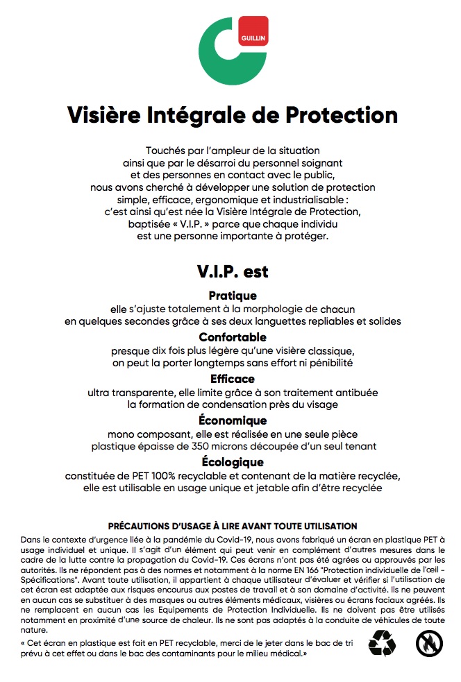 Touché par l’ampleur de la situation sanitaire ainsi que par le désarroi du personnel soignant et des personnes en contact avec le public, le groupe Guillin a développé une solution de protection simple, efficace, ergonomique et industrialisable.