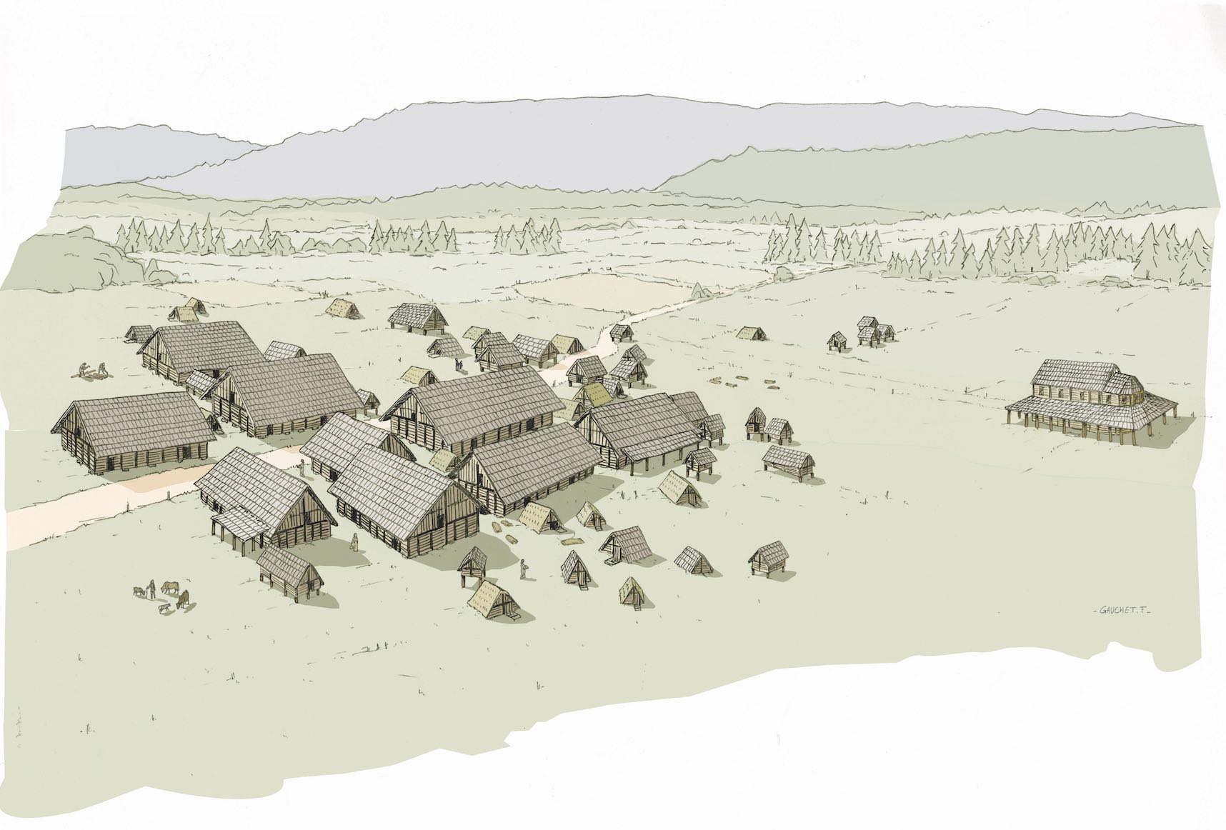 La fondation du village prend place au cours de l’époque mérovingienne et son occupation se déploie sur moins de 200 ans durant les VIe et VIIe siècles. Le cœur du site couvre environ 1 hectare. Deux aspects frappants de son plan sont l’organisation orthonormée et le resserrement des bâtiments principaux.