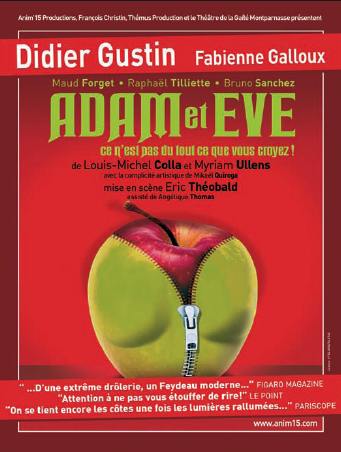 Adam et Eve, ce n’est pas du tout ce que vous croyez… Un homme, une femme et de jeunes étudiants, se retrouvent dans une garçonnière haut de gamme… mais ce n’est pas du tout ce que vous croyez ! La curiosité est un vilain défaut… elle provoque la rencontre de Monsieur Franck Adam, charcutier traiteur (Didier Gustin) et Madame Eve de Spéville, journaliste romancière (Fabienne Galloux), dans ce lieu pour le moins insolite, inattendu et haut en couleurs… L’arrivée inopinée des jeunes, que l’on pouvait imaginer crédules et naïfs, entraîne quiproquos et situations cocasses.Les rebondissements, les éclats de rires s’enchaînent dans un rythme effréné ! Une comédie actuelle. On en sort épuisé et heureux d’avoir autant ri.
