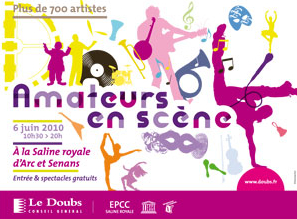 Pour la cinquième année consécutive, le Conseil général du Doubs organise, la journée « Amateurs en scène » le dimanche 6 juin 2010 à la Saline royale d’Arc-et-Senans. Le Département accueille les artistes amateurs du Doubs à la Saline royale, monument historique, inscrit au Patrimoine mondial de l’UNESCO depuis 1982.