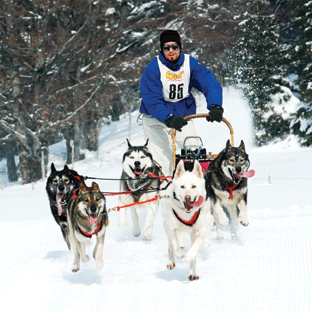 > le ski jöring : le skieur ou ski-jögger est directement attaché au chien par une longe élastique. Cette discipline remporte un vif succès en Europe.