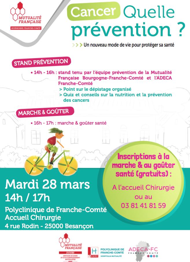 C’est pourquoi, la Mutualité Française Bourgogne-Franche-Comté, en association avec les structures de dépistage proposent un atelier gratuit à la Polyclinique de Franche Comté le mardi 28 mars de 14 à 17 heures Au cours de cet atelier de 3h, des professionnels de santé vous permettront de :