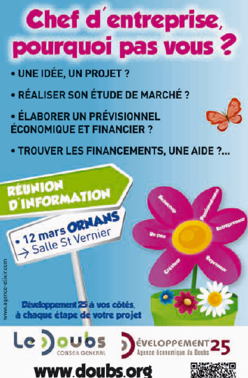 Ils pourront également partager avec des créateurs d’entreprise venus présenter leur parcours. Ces rencontres ont lieu tous les mardis à 18h30 dans tous les cantons du département, en présence du Conseiller général concerné, dont le 12 mars à Ornans (Salle St Vernier) et le 26 mars à Vaux-et-Chantegrue (Salle des fêtes). Des ateliers thématiques (par groupe de 8 à 12 personnes, le lundi de 9h à 12h) permettent de booster l’activité des entreprises.