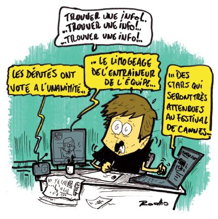 Villages FM : Comment fais-tu pour choisir les infos à dessiner ?Rodho : Cela dépend de beaucoup de choses, mais en général c’est celle qui me donnera l’idée la plus absurde. Ce ne sera donc pas forcément l’info la plus entendue de la journée mais tout simplement celle qui m’aura le plus inspiré.