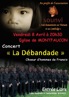 La Débandade est un chœur d’hommes de Franois, constitué de personnes dirigée par le Chef de c couvre un large éventail de genres contemporaine ou non, à la musique sacrée caritatives, le chœur se produira le Vendredi 8 Avril à 20H30 à l’Eglise de Montfaucon pour l’association SOUNVI. Sounvi est une association d’étudiants qui vient en aide aux orphelins Vietnam et du Cambodge.