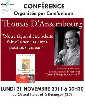 Dans le cadre de ses activités conférences et formations sur la Communication Nonviolente (CNV), encouragée par le succès des deux précédentes conférences organisées depuis 2005 « Cessez d’être gentil, soyez vrai » « Les couples heureux ont-ils un secret ? », l’association à ré-invité Thomas d’Ansembourg en Franche-Comté le 21 novembre 2011 pour une conférence unique. A cette occasion, l’auteur et conférencier international qui a allumé l’étincelle de la CNV dans les pays francophones, proposera son éclairage, fruit de plus de vingt ans d’expérience de l’accompagnement des jeunes et des adultes.