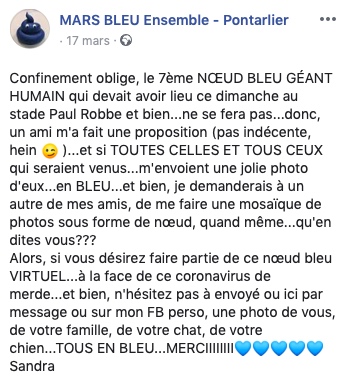 Ainsi, tout le monde peut participer depuis chez lui : il suffit d’envoyer une photo de soi habillé en bleu à l’équipe organisatrice.