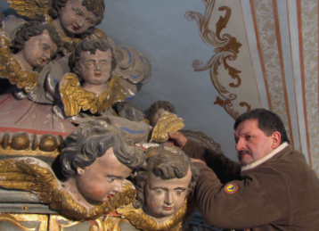 (Légende photo : Philippe Bulle lors d’une restauration du choeur en bois, classé monument historique, dans une église de la région).