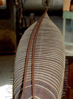 La deuxième étape consiste à courber à la vapeur de fines lamelles de frêne, les membrures, qui seront placées sur toute la largeur du moule afin de réaliser le fond de la coque et ainsi donner la stabilité au bateau.