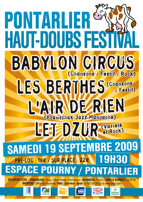 Cette année, avec Babylon Circus en tête d’affiche, nous avons voulu encore et toujours aller de l’avant pour faire progresser vers le haut la qualité de la programmation. Tout en restant ouvert aux groupes locaux (pontissaliens et francs-comtois) avec une programmation de musiques actuelles en passant par les styles festifs, nouvelle chanson française, jazz manouche et variété pour l’édition 2009.