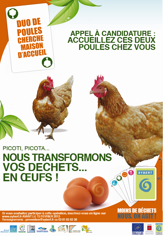 Le SYBERT, Syndicat mixte de Besançon et de sa région pour le traitement des déchets, a lancé en ce début d’année 2013, l’opération « des poules pour mes déchets ». Le principe est simple : le SYBERT vous donne deux poules et durant quelques mois (de mars à juin) vous pesez votre poubelle grise pour constater l’allégement de vos déchets. Pour ce faire, le SYBERT cherche une quinzaine de foyers prêt à accueillir deux poules chez eux pour tester ce principe.
