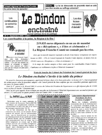 En 2000, la Société Protectrice des Contribuables (SPC) voit le jour à Lons-le-Saunier se donnant comme but d’informer les citoyens sur la conduite des affaires publiques et la gestion des finances. Sous l’impulsion d’Alain Pernot et Morad El Hattab et afin de remplir au mieux cette mission, la SPC se lance dans la création d’un « journal satirique de la vie publique » intitulé le Dindon Enchaîné, en hommage au Canard Enchaîné. Empruntant le ton satirique de son aîné, le Dindon s’attache à rendre accessible les informations et les décisions prises au sein des collectivités territoriales de sa région, plus particulièrement du Jura. Par conséquent, les auteurs dénoncent les abus en tout genre. Indemnités faramineuses, avantages en nature, longévité abusive des élus au sein des collectivités : autant de dérives que ce gallinacé fouineur n’hésite pas à relever. Mais l’édition papier nécessitant un investissement financier et personnel important, Alain Pernot décide en 2004 d’utiliser le Web qu’il qualifie d’”outil fabuleux pour une expression libre”. Plus souple et moins onéreux, le portail ledindon.net permet de diffuser au plus grand nombre des rapports officiels (délibérations, rapports d’activité…) et quelques travaux d’investigation. “Notre démarche est avant tout citoyenne. Nous devons en tant que citoyen avoir un regard critique sur le fonctionnement des collectivités territoriales. (…) Nous souhaitons mettre les élus face à leur responsabilité”. Au sommaire du tout nouveau Dindon Enchaîné (n°9) actuellement disponible en kiosque : la présence (et de fait les absences) des députés locaux à l’Assemblée, l’Hôpital de Champagnole, des brèves sur l’actualité politique sans oublier les rubriques habituelles la mare aux dindons, la brosse à reliure et autres pattes dans le plat.