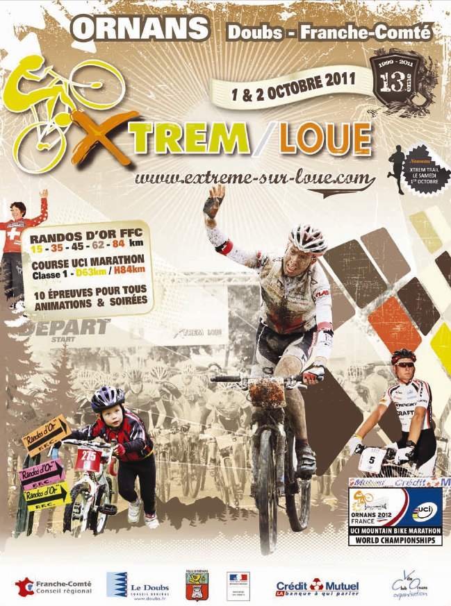 En 13 ans l’Extrême sur Loue aura atteint le plus haut niveau d’exigence que le VTT peut revendiquer. Après l’organisation de nombreux Championnats nationaux et d’une manche de Coupe du Monde, l’accueil de 30 000 participants et la fidélisation de 600 bénévoles, un nouveau défi de taille est au programme pour l’automne 2012. Poursuivre son essor, entretenir l’investissement unique de ses bénévoles et la fidélité des nombreux participants était l’objectif. Avec les Mondiaux 2012 et plus de 60 nations présentes, des infrastructures hors normes, une logistique millimétrée, des animations sportives et festives et les marques les plus prestigieuses réunies, Ornans va être gâtée. Mais pour atteindre ce niveau d’exigence, une montée en puissance de l’épreuve a été nécessaire. 2010 fut un premier cap, 2011 sera une nouvelle marche à franchir. Un vrai test grandeur nature pour une mise en situation au format international.