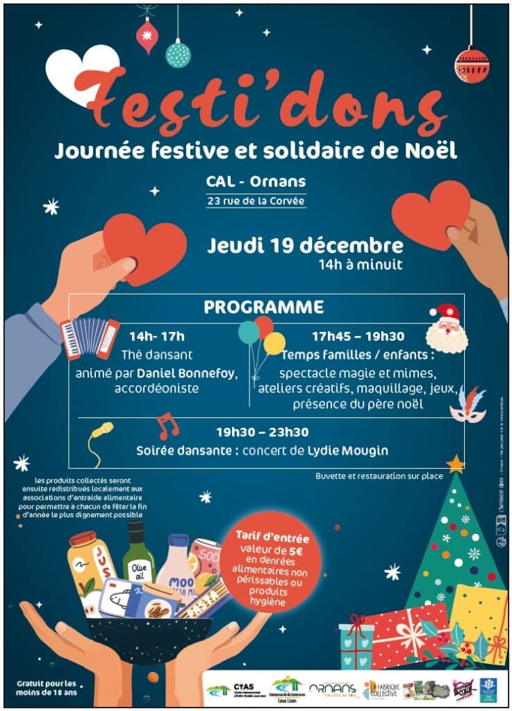 Le jeudi 19 décembre 2024, le territoire Loue Lison vibrera au rythme de Festi’dons, une journée festive et citoyenne organisée par le Centre Intercommunal d’Action Sociale (CIAS) et la Communauté de communes Loue Lison, en partenariat avec La Fabrique Collective de la ville d’Ornans, l’Épi Solidaire de Quingey et les Restaurants du Coeur d’Ornans.