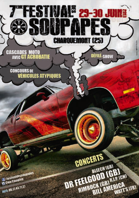 Samedi : Ouverture à 14h. Rassemblement tous véhicules (motos, voitures, trikes, tracteurs, quads…), Bill America en concert, cascades motos avec GT ACROBATIE, show des Libertines (danse sur bar, défilé de sous-vêtements, strip-tease), concours de véhicules atypiques. 3 concerts le samedi soir à partir de 21h: Bleech (Angleterre), DR FEELGOOD (Angleterre), Watt’s (France), feux d’artifice.