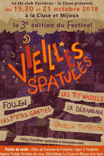 Le ski club des Verrières-la Cluse est toujours à la recherche d’idées nouvelles dans ses projets extra-sportifs indispensables à la vie et au fonctionnement du club. À l’unanimité ils ont décidé d’organiser la 3e édition du Festival des Vieilles Spatules. Programmation haute en couleur qui privilégie des artistes locaux qui ont déjà connu la scène et qui ont tous eu beaucoup de succès. Ils sont heureux et fiers de participer à cette fête. L’ensemble du ski club compte sur votre présence durant ce weekend et vous souhaite un super Festival !