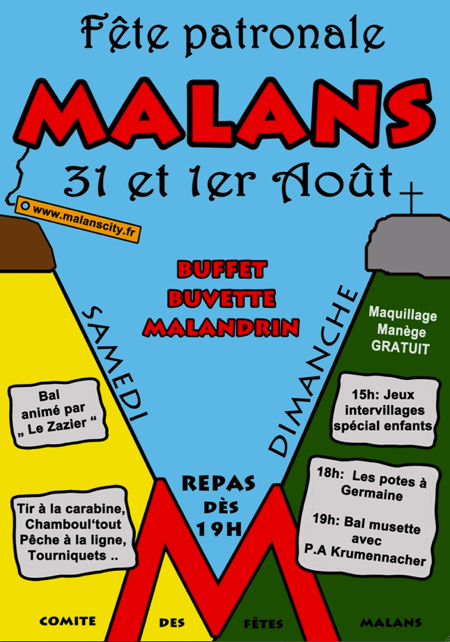 A Malans tout est un peu différent, ce petit village d’un peu plus de 150 habitants a su créer une fête de renom qui attire les foules depuis plus de trente ans. Les anciens ont su apporter beaucoup de convivialité à cette fête et aujourd’hui c’est toujours dans cette ambiance de joyeux fêtards que petits et grands font perdurer cette fête.