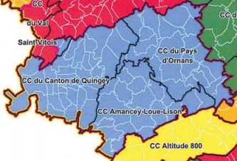 Il y a donc comme annoncé la fusion de la communauté de communes du Pays d’Ornans (22 communes /11 183 habitants), avec la communauté de communes Amancey Loue Lison (20 communes / 4 074 habitants), et la communauté de communes du canton de Quingey (34 communes / 9 313 habitants), et extension du périmètre de ce nouvel EPCI à fiscalité propre aux communes d’Abbans-Dessous (244 habitants) et d’Abbans-Dessus (301 habitants).