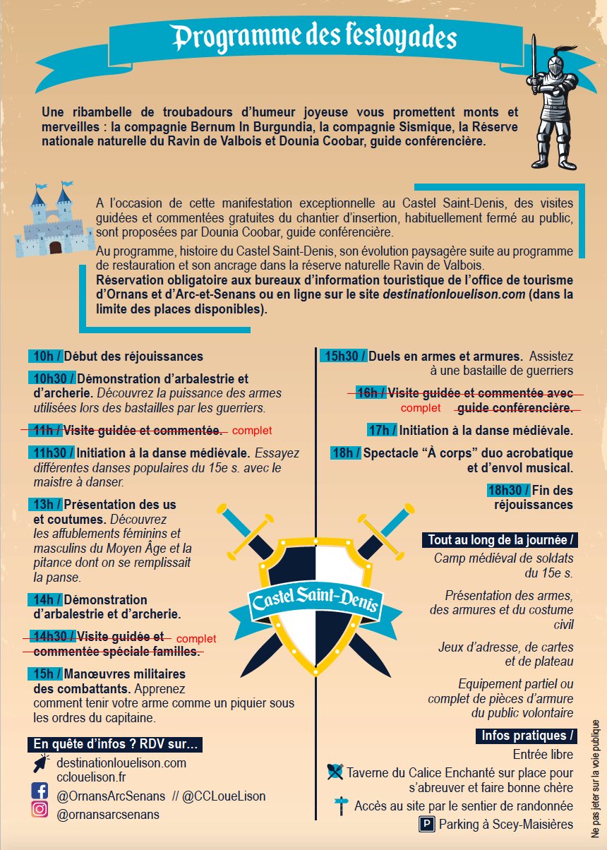 Petits et grands pourront ainsi découvrir la vie au MoyenÂge et passer un agréable moment festif et convivial. La ribambelle de troubadours des festoyades, à savoir la compagnie de Bernum In Burgundia, la réserve naturelle nationale du Ravin de Valbois, la compagnie Sismique et Dounia Coobar, guide conférencière, vous promettent monts et merveilles.