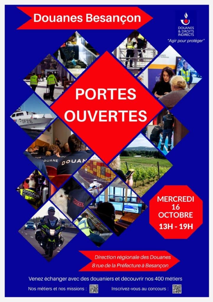 Afin de faire connaître ses métiers, la direction régionale des douanes de Besançon vous ouvre ses portes le mercredi 16 octobre prochain de 13h à 19h, au 8 rue de la Préfecture.