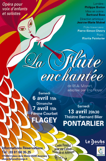 Le Centre Familial pour une Culture Musicale et Artistique (CFCMA), implanté dans le canton d’Amancey, a pour vocation de promouvoir la culture et d’encourager la pratique musicale, vocale et artistique auprès des amateurs ou des professionnels. Dans cet objectif, le CFCMA a créé l’opéra La flûte enchantée adapté par Eric Noyer pour voix d’enfants et de solistes accompagnés d’un arrangement musical pour piano et flûte traversière.