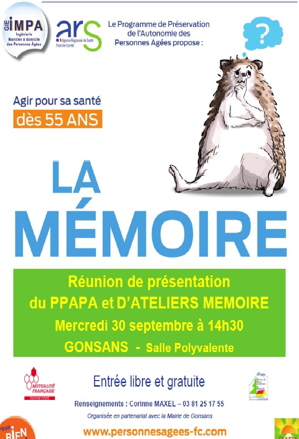 L’espérance de vie en France continue de progresser, mais après 65 ans, les années en bonne santé sont inférieures à celles de nombreux pays européens. Devenir acteur de sa santé pour prévenir les risques et rester en bonne santé le plus longtemps possible reste essentiel. La Mutualité Française Franche-Comté en partenariat avec le GIE IMPA dans le cadre du Programme de Préservation de l’Autonomie des Personnes Agées organise une séance de présentation d’atelier mémoire.