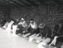 lieu de rencontres pour les femmes du village. Une fois par an, c’était la grande lessive, les femmes lavaient le linge « au cuveau ». Elles empilaient le linge au fond d’une marmite (draps, chemises, linge de corps). Un sac de cendres était placé par dessus sur lequel elles versaient des casseroles d’eau bouillante. Cette macération recuisait toute la journée et le linge était enfin rincé et essoré. La généralisation de l’eau courante dans les habitations puis l’apparition des premiers lave-linge dans les années 60 a mis fin à ce métier.