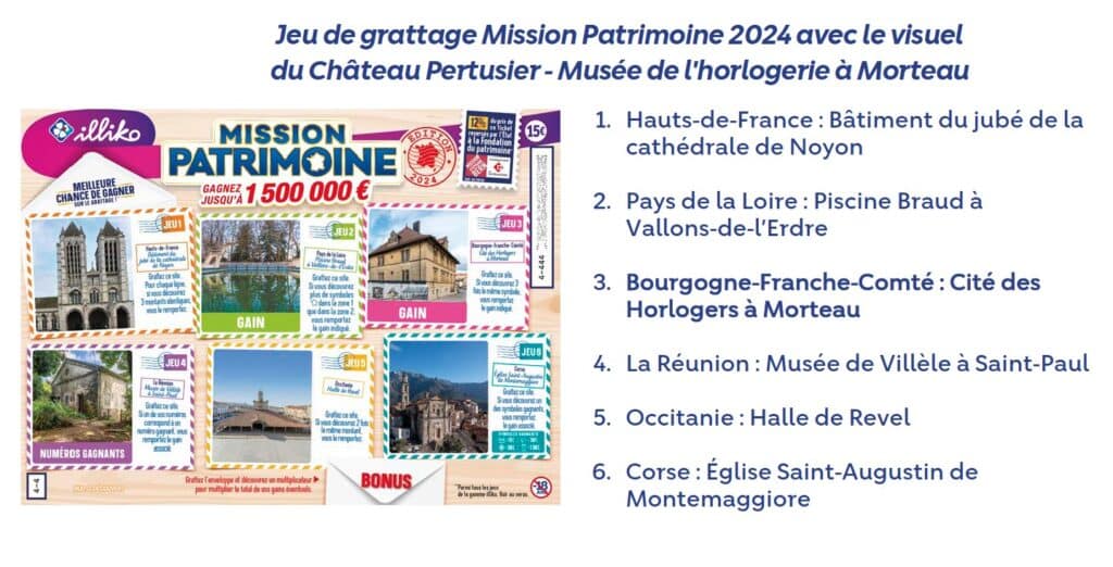 Le Château Pertusier – Musée de l’horlogerie à Morteau figure sur une des trois versions du jeu de grattage Mission Patrimoine 2024 qui met en valeur les dix-huit sites emblématiques de cette édition. Au total, cent dix-huit sites bénéficieront du soutien de la Mission Patrimoine cette année.
