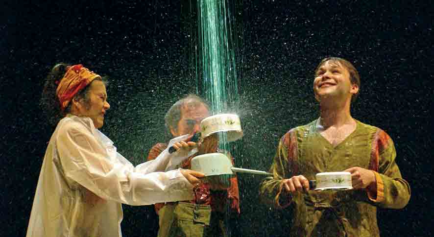 Bernard Kudlak : La moitié des gens sont depuis longtemps au Cirque Plume. Il y a des musiciens et acteurs de cirque sur des jeux comiques… jongleurs, contortionnistes, acrobates, il y a des numéros aériens, de l’équilibre… Les arts du cirque sont très représentés. Et c’est au sein de cette magie du cirque que s’insinue la goutte d’eau et le cirque en profite pour créer des choses