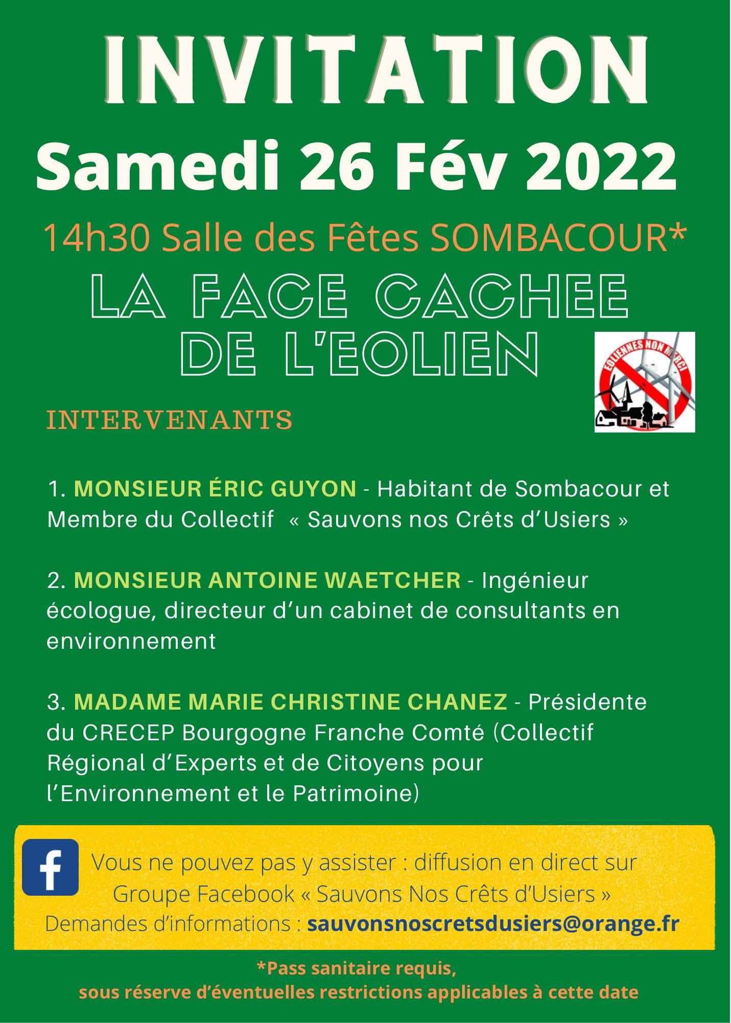 Cette réunion a pour ambition de sensibiliser tous les habitants du secteur à la face cachée de l’éolien. Dans un premier temps une synthèse du reportage « Du Rêve à la Réalité » sera présentée par Mr Eric Guyon – habitant de Sombacour et membre du Collectif « Sauvons nos Crêts d’Usiers ».