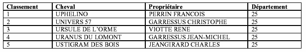 A l’issue de l’épreuve de traction, Mickael Robert, aux guides de Tara du Lac termine à la 5ème position. Lors de la seconde et dernière épreuve, celle de maniabilité rurale, il occupe la 4ème place. Au classement général donc, l’équipe comtoise termine 4ème, derrière les Trait du Nord, les Boulonnais puis les Bretons.