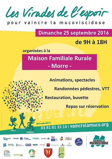 De plus, comme l’année dernière, l’association lance à nouveau le défi sportif qui consiste à courir un trail (le dimanche 23 octobre 2016) de 12 kms en compagnie de Nicolas, jeune homme atteint de la mucoviscidose et des élèves de la MFR encadrés par leurs moniteurs. Cette épreuve est un des moyens pour récolter des dons au profit de l’association « Vaincre la mucoviscidose« .