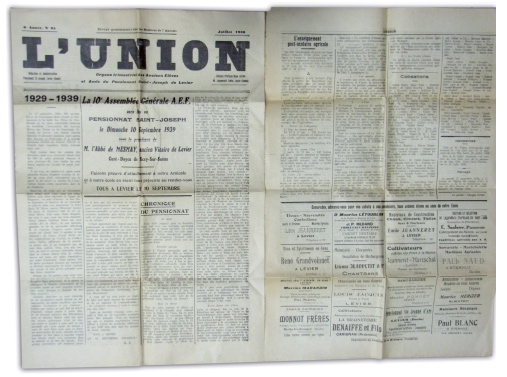 Dans le grenier du « pensionnat Saint-Jo », sous de la paille et de la poussière, cachée par les antennes de télé, c’est toute une collection de revues qui a été découverte par ceux qui se nomment « les Vieux Crampons ». Peu d’habitants de Levier ont souvenir de l’existence de ces revues. Il s’agit de L’Union: « organe trimestriel des anciens élèves et amis du pensionnat Saint-Joseph de Levier ». Cette revue était envoyée gratuitement à tous les membres de l’amicale. Le premier exemplaire date de janvier 1930, ce qui correspond à la date de la création de cette amicale. Au total, pas moins de 66 numéros en excellent état, couvrant la période jusqu’en juillet 1939 ont été mis à jour. 26 numéros différents sont recensés. Il manque donc 9 exemplaires originaux. Le contenu est passionnant, des articles d’actualité de l’époque, certains de fonds comme celui de Mgr Chollet en 1935 sur l’éducation. Une mine d’informations que René Dubrez, l’initiateur des rencontres avec ses copains d’antan, sera en mesure de délivrez prochainement.