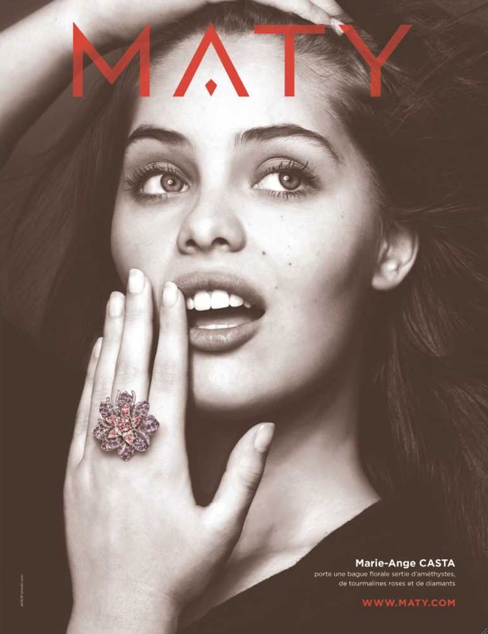 Choisie pour son charme, sa spontanéité et sa beauté naturelle, Marie-Ange Casta incarne parfaitement la femme Maty. La nouvelle campagne sera visible dès le mois de novembre : un portrait de la jeune femme en noir et blanc portant une création Maty, seul élément présenté en couleur, illustrera toute la modernité de la marque.