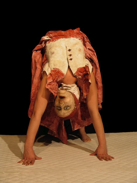 Sur un grand lit qui grince terriblement, la comédienne se transforme sous la couette en Petit Chaperon rouge, en loup, en grand-mère. Laurie Cannac manipule de troublantes marionnettes faites de papier mâché avec les différentes parties de son corps.