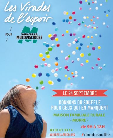 Pour que cette manifestation soit un succès, pour saisir l’occasion de faire un peu ou beaucoup de sport, pour se divertir, pour que les enfants s’amusent et passent une magnifique journée, pour se restaurer ou simplement boire un verre à la buvette, pour qu’un maximum de fonds soit collecté, pour soulager le quotidien des malades, pour que l’espoir de guérir la mucoviscidose très prochainement se concrétise, alors tous aux Virades de l’Espoir dimanche 24 septembre à la MFR de Morre.
