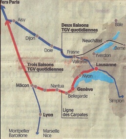 A cette occasion ils ont annoncé le renforcement de la desserte Paris-Lausanne qui serait portée en 2014 de 4 à 5 allers-retours. Mais 3 de ces AR ne passeraient pas par la Franche Comté ni par Dijon mais par le Haut Bugey (« les Carpates ») et GENEVE ! Ainsi à l’horizon 2014, seuls les 2 allers retours des pointes de matinée et de soirée emprunteraient encore l’itinéraire via Dijon, Dole et Vallorbe.