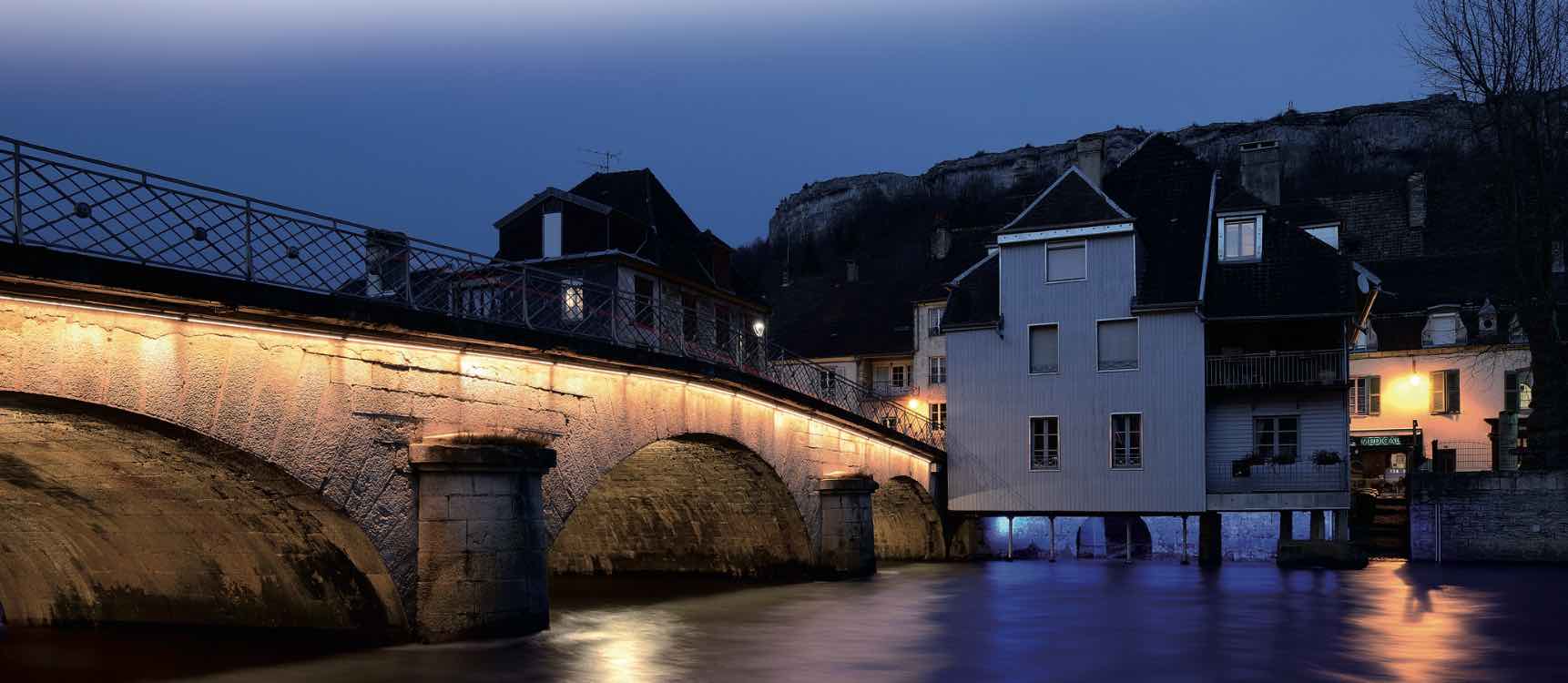 Le souhait exprimé par Jean-François Longeot, sénateur maire d’Ornans, à Thierry Walger, de l’agence Le Point Lumineux, se réalise : toute la ville, à la nuit tombée, s’habille de lumière et laisse apparaître toute la beauté et le charme des maisons, berges, passerelles, ponts… grâce à de somptueux effets lumineux qui ponctuent l’environnement jaune sodium de la ville : une variation de bleus profonds pour les maisons en encorbellement ; une ponctuation de lumière irisée de cyan pour les places publiques bordant la rivière ; un appel lumineux en bleu standard invitant les promeneurs à emprunter les accès à la rivière et une lumière blanche qui marque les franchissements, pour un coût de 227 866 € HT (financement Ville d’Ornans + SYDED).