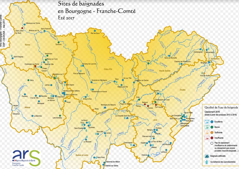 Ainsi, en 2016, sur les 79 sites de baignades naturelles recensées en Bourgogne- Franche-Comté, les résultats du classement ont été les suivants (voir carte ci-jointe) :