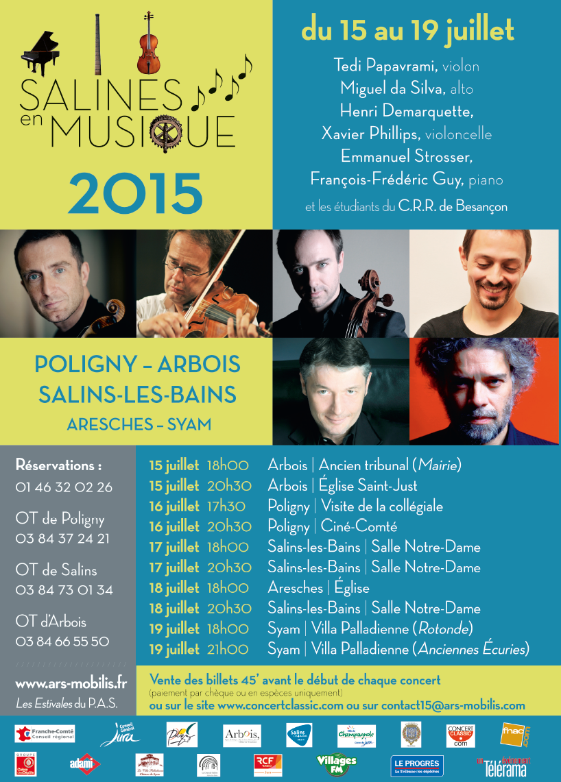 Dotée d’un centre thermal et de remise en forme, la ville de Salins offre aux futurs festivaliers un cadre naturel et architectural exceptionnel. Mais Salines en musique est aussi un festival itinérant qui propose également des concerts à Arbois, Aresches , Syam et en 2à15, nouveauté : Poligny.
