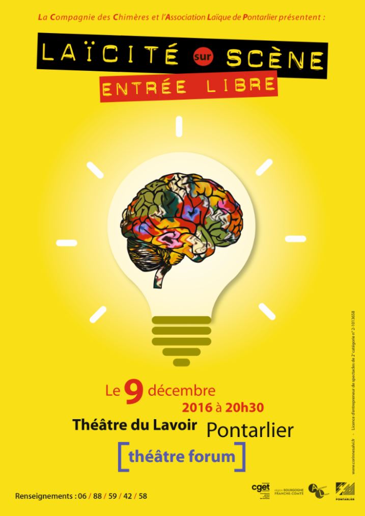 Depuis 2013, l’Association Laïque de Pontarlier (ALP) saisit l’occasion de la journée anniversaire de la loi de séparation des Eglises et de l’Etat pour mettre à l’honneur la laïcité, son histoire et sa portée universelle. Cette année, elle s’associe à la Compagnie des Chimères pour proposer une séance de théâtre forum : « Laïcité sur scène – Entrée Libre » au cours de laquelle les comédiens joueront des saynètes inspirées du réel, mettant en scène des situations concrètes, quotidiennes mais conflictuelles autour des questions de laïcité. Les spectateurs seront invités à réagir, à débattre, à monter sur scène. L’objectif étant de prendre le temps de réfléchir ensemble et de mettre peut-être un peu de raison là où règnent les passions…