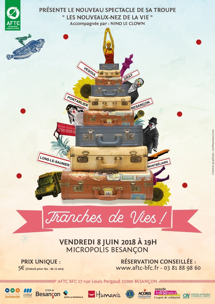 Un travail préparatoire est en cours depuis septembre sous forme d’ateliers itinérants animés par Nino le clown sur 6 sites de la Franche-Comté. Il sera complété par deux jours de préparation en résidence pour l’ensemble de la troupe avant le spectacle. Ce spectacle s’intitule : « Tranches de Vies » et sera présenté par la troupe de l’AFTC « Les nouveaux nez de la vie » accompagnée par Nino le clown.