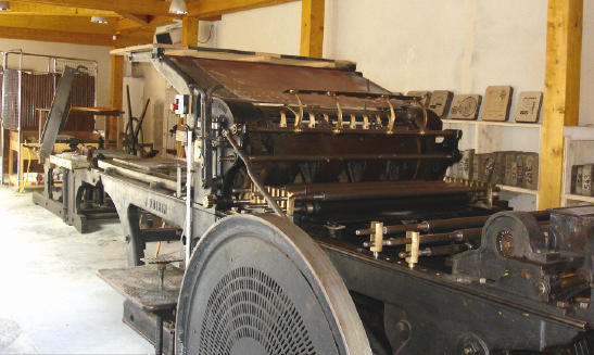 Une fois le tracé exécuté, la pierre est placée sur la presse lithographique et humidifiée pour l’impression ; étant poreuse, la pierre calcaire retient l’eau. L’encre grasse est alors déposée au moyen d’un rouleau