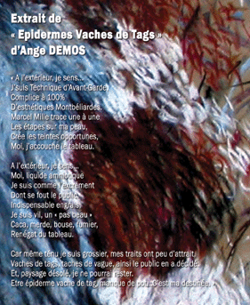 De nombreux projets se bousculent aujourd’hui dans l’atelier de Marcel Mille. Une nouvelle série sur le vêlage (qui sera présentée à la Biennale des Arts Plastiques en Octobre à Micropolis) voit le jour tandis que la collaboration avec l’auteur mélodiste Ange DEMOS porte ses fruits. Les mots et les sons d’Ange, percutants et légers, incisifs et poétiques, ont fait mouche auprès du peintre. Quant aux vaches de Marcel, elles paraissent pour Ange DEMOS si proches de l’humain : comme une force bienveillante de la nature, une mère nourricière. L’alchimie de cette rencontre amène les tableaux de Marcel à rentrer en dialogue avec les créations d’Ange. Ensemble, ils exposent actuellement « Vaches de Tags » à l’Espace Culturel de la Mairie de Gellin jusqu’au 18 mars. Une dernière série entre déjection et recyclage, entre salissures et essuyages de doigts, qui ne manquera pas, une fois de plus, de vous interpeller !